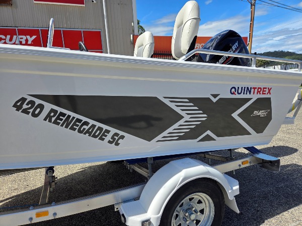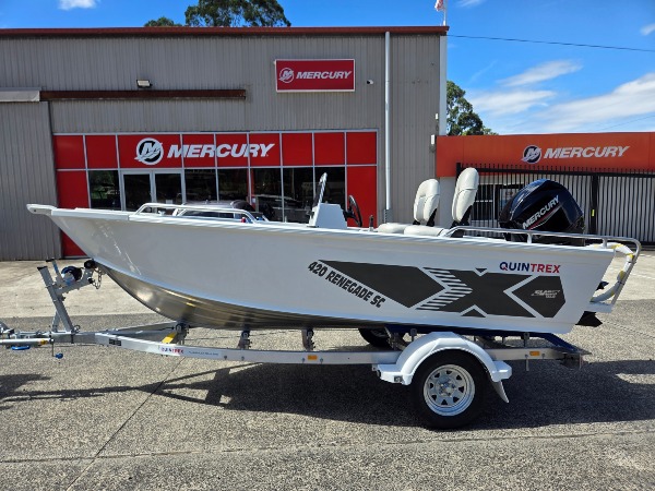 IN STOCK AND AVAILABLE NOW Quintrex 420 Renegade SC aluminium side console . Don't wait, enquire today! Powered by a Mercury 50hp 4-stroke with a white painted hull, welded top deck & gunnels & flipper guide kit . This boat also has a Fishing Pack which includes Console Vertical Rod Storage, Quintrex Esky 22L, Stainless Steel Rod Holders & Seatred Top Deck Kit. Awarded as the Quintrex NSW Dealer of the Year for 2024/2025 – experience unbeatable savings on Quintrex boats and Mercury engines. Contact us today and get the best deals from the best in the business! Finance available from $135.88/week **Terms and conditions, Credit fees and charges and credit criteria apply. The payment per week is an indication only and is based on the advertised price, 20% deposit over a 60 month term at an annual percentage rate of 10%. The comparison rate is 11.47% and is based on a secured loan of $30,000 for a term of 5 years. WARNING: The comparison rate only applies to the example given. Different amounts and terms will result in a different comparison rate. Finance is provided by Mercury Finance Pty Ltd ABN 28 156 248 092. Australian Credit Licence Number 421347. Boat, Motor & Trailer package includes Quintrex 420 Renegade SC, Mercury 50hp 4-stroke & Quintrex alloy 900kg braked trailer. We can also arrange competitive finance rates T.A.P. and on the spot comprehensive insurance quotes. Do you have a boat to sell!! We are always looking for good quality used boats to purchase, sell on consignment or trade. We are a family owned and operated business servicing the with Australia's number 1 brands. Dealers for Quintrex and Edencraft boats, Mercury and Mercruiser engines and stocking only the highest quality used boats, there is no reason why we can't get you into the boat of your dreams. INSINC MARINE QUINTREX NSW DEALER OF THE YEAR 2013/2014, 2017/2018 & 2024/2025 QUINTREX BMT DEALER OF THE YEAR 2022/2023 MERCURY NSW DEALER OF THE YEAR 2020 & 2021