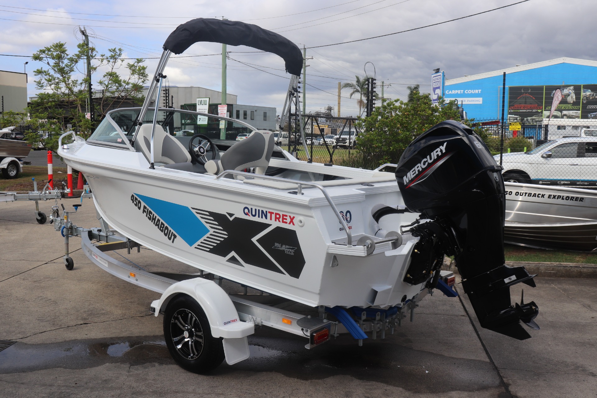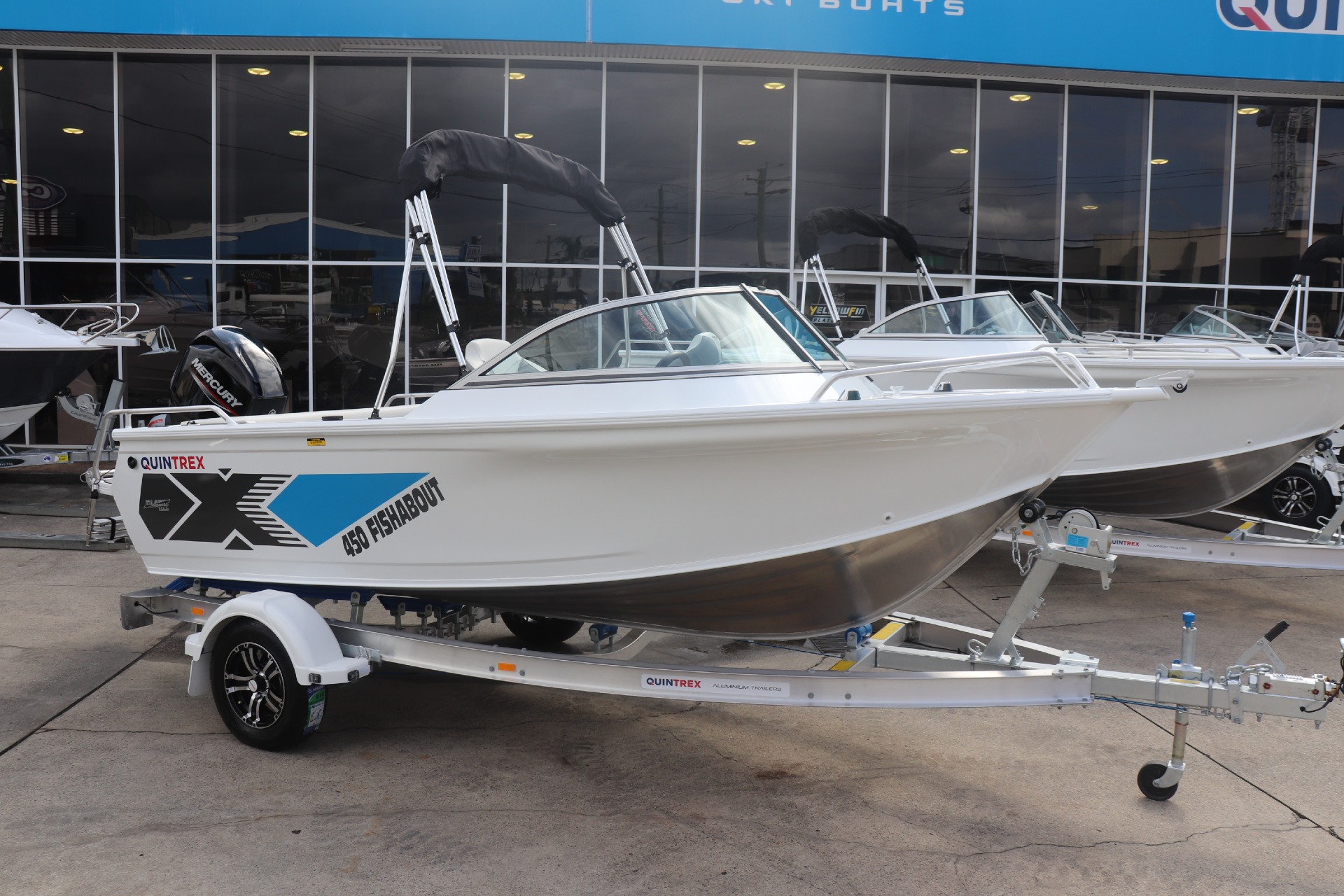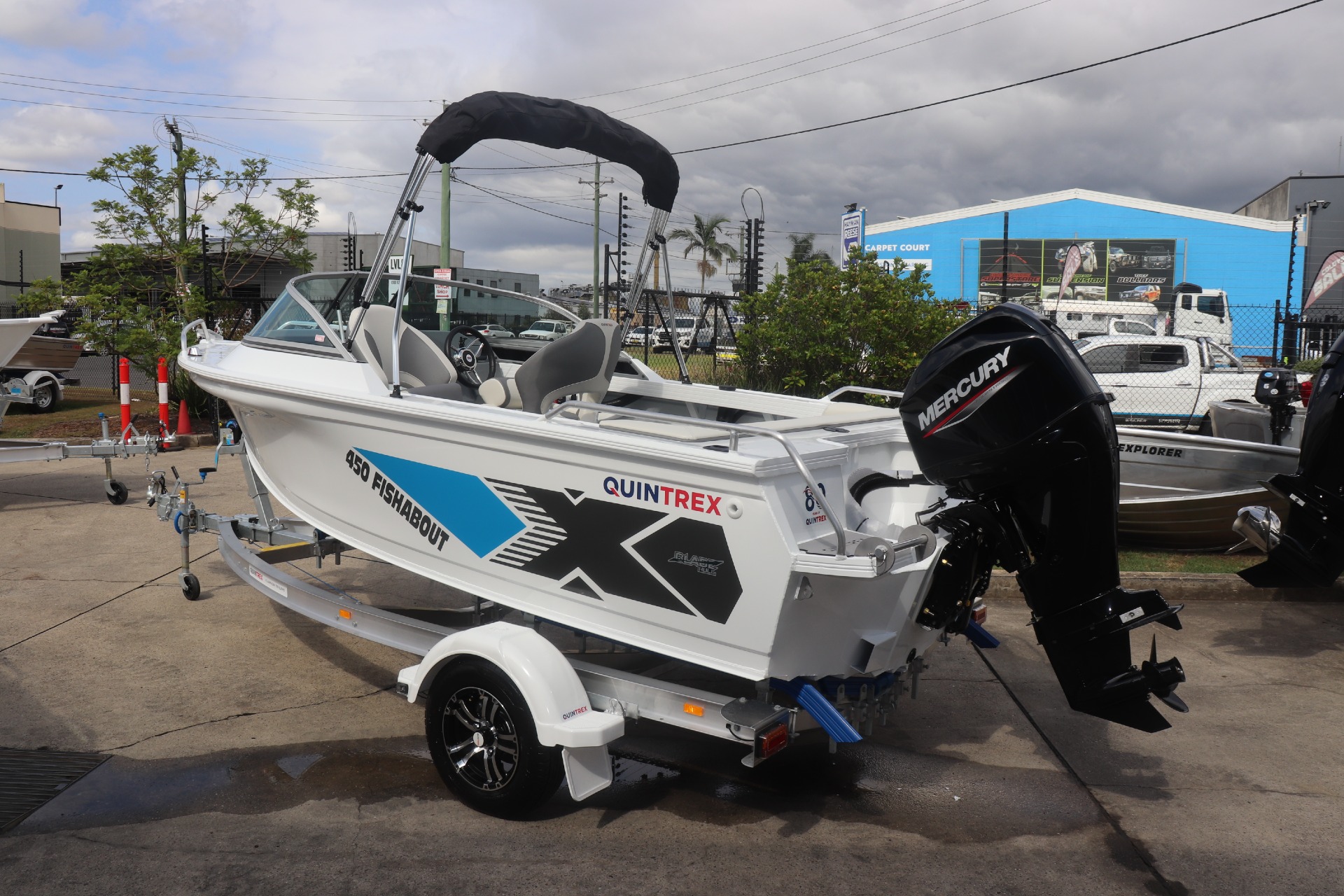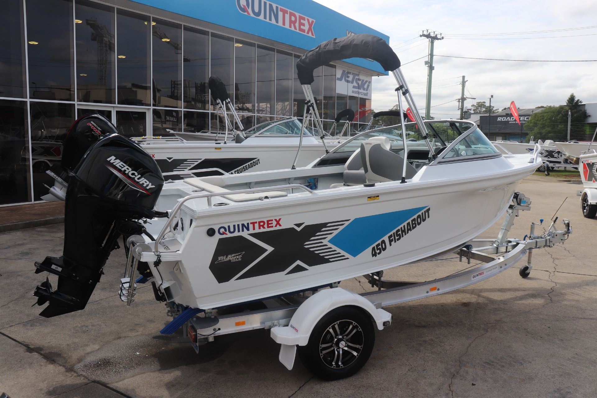 QUINTREX 450 FISHABOUT POWERED BY A MERCURY 60HP 4 STROKE ON A QUINTREX ALLOY TRAILER ***READY FOR IMMEDIATE DELIVERY...ENQUIRE NOW*** PLEASE READ... is a Highly Reputable NSW Quintrex Specialist dealership. All our Quintrex Boats are CORRECTLY advertised showing Standard specifications and detailing the factory fitted options that have been installed to assure you are buying the right Boat. The photos we display in our ads are of the exact boat for sale, powered by the best suggested Horsepower engine assuring you are buying the Perfect boat from a reputable Dealership at a fair price. FEATURES INCLUDE: ALL STANDARD FEATURES: Battery Box Bow Roller Glove Box Pole Mount Insert Rear Ladder Rod Holders (2) Anchorwell Cleat On Front Deck Extruded Side Decks Fully Weld Gunnels & Side Decks Lean Through Dash Side Pockets Sports Dash Transducer Brackets x 2 Painted Hull Rail: Transom Grabrail Rails Rails: Side Windscreen Seat Slider Seats: Angler Sport Seats: Rear Lounge and Backrest Helm: Mechanical Tilt Steering ADDITIONAL FACTORY FEATURES INCLUDE: Comfort Pack - Bimini & Envelope - Deluxe rear Lounge & Backrest - Upgraded Maritime Sports Seats Cargo/Luggage Netting Garmin Striker VIVID 7SV Mercury SC1000 Digital Tacho Upgraded Steering Wheel TR MARINE ADDITIONAL FEATURES INCLUDE: 12 Months NSW Boat & Trailer Registrations Paddle, Bucket, Horn & Torch Rear Tie Down Straps Fire Extinguisher Earmuffs (Engine Flusher) 5 x PFD1 Life Jackets Anchor, Rope & Chain *We have a well-stocked undercover Showroom and are open 6 days a week. *Need Finance? We're here to help get you on the water sooner with Mercury Marine Finance *Give us a call today to speak with one of our friendly team members 6 Year Mercury Factory Engine Warranty*