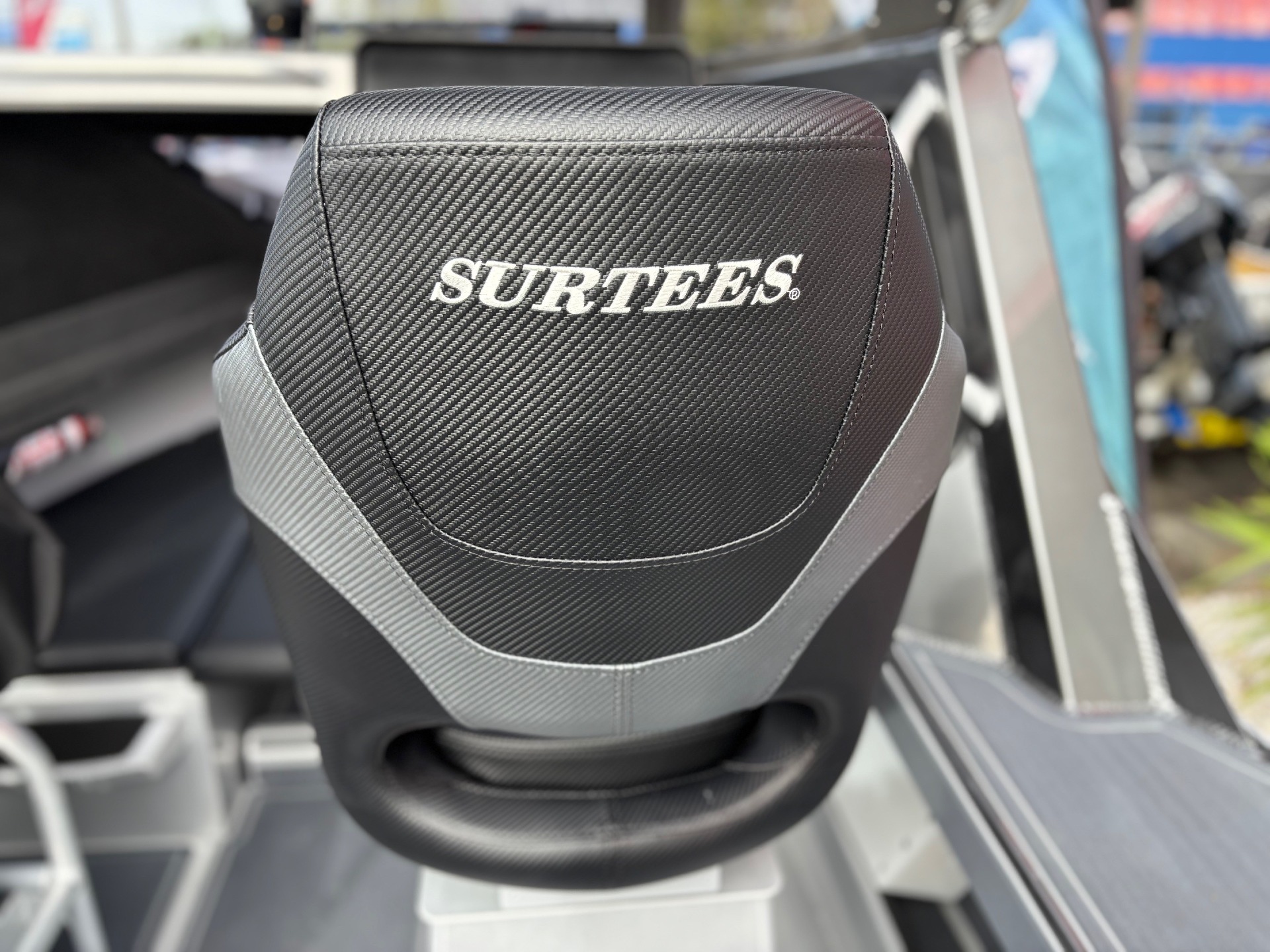 1 USB and 1 USBC Outlet Battery Voltage readout 110i VHF & 1.8M Aerial 6 fully welded stringers Bow roller & bollard Anchor, rope and chain Large dashboard Spray deflection chines Cup holders Grab rails - bow, side and stern 2 x 4 Way backlit switch panel Hydraulic Steering Fully welded tread plate floor Anchor locker Large forward tinted hatch Side storage shelves Deck grip Full graphics Offshore transom with boarding platform Walkthrough transom with live bait tank Battery Tray, isolation switch Fuel filter and fuel line Full cabin seating 3 X squabs Surtees branded prop flag